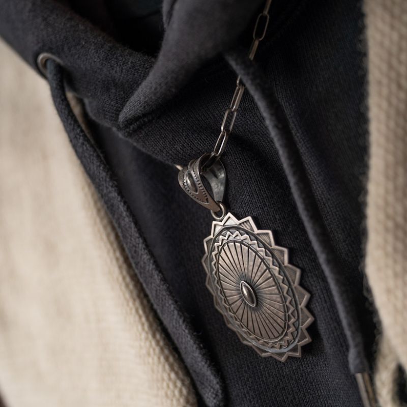 | Navajo/ナバホ族のアーティスト Jacob D. Morgan/ジェイコブ・モーガンによるペンダントです。 14ga(約1.6mm)のシルバープレートにサンバーストをデザインした作品、ナバホのコンチョバックルに使用されるものをイメージして制作して頂いた伝統的スタイルのペンダントです。 一つ一つ丁寧に打たれたスタンプは正確で、バチカンに施されたデザインはバンプアウトと呼ばれるオスとメスのタガネを使用することで凹凸を生み出し、テクスチャーを加わえることで作品に渋みと強弱をつけます。また形状はフラットではなく、ドーム状になっていますので、優しく立体感を感じます。 しっかりとしたサイズ感はチェーンをどうするか悩むところですが、雰囲気のあるアンティーク仕上げはホピチェーンと合わすことでバランスを整えます。画像ではホピチェーンMサイズを使用しています。バチカンが広いのでナバホパールで組み合わせても安定します。 その日の洋服に合わせてスタイリングをお楽しみください。 |