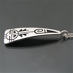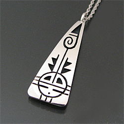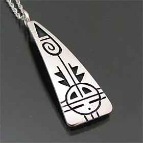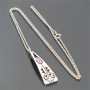 | HOPI/ホピ族のアーティスト Clifton Mowa/クリフトン・モアが制作したネックレスです。 オーバーレイ技法を用いて、人気のモチーフサンフェイスがデザインされています! サンフェイスは万物の創造主で絶対神。厳密には遠い宇宙にいる神が人間の暮らしを見守るための窓だと言われています。 シャープな形で、スタイリングしやすいアイテムでございます! 1983年からシルバー制作を開始したクリフトン・モアは大胆で様々なモチーフを使った作品を制作しております! | ||