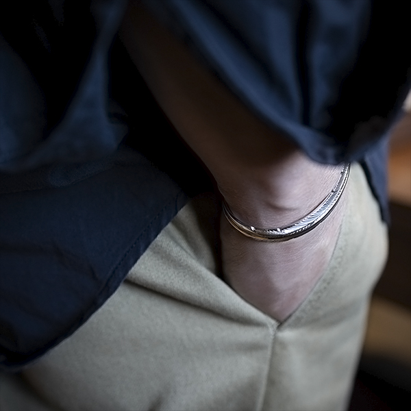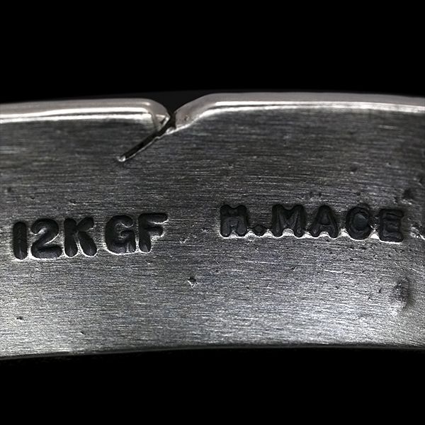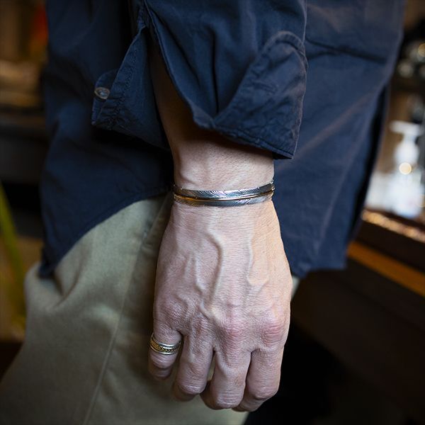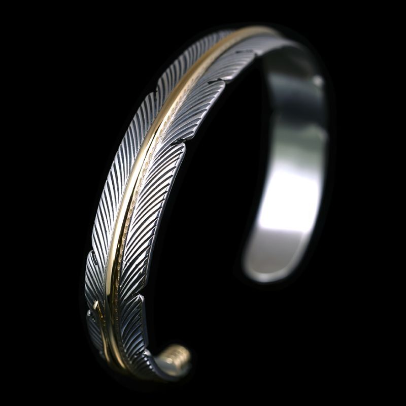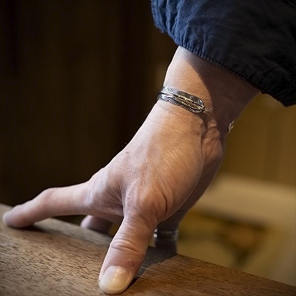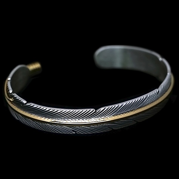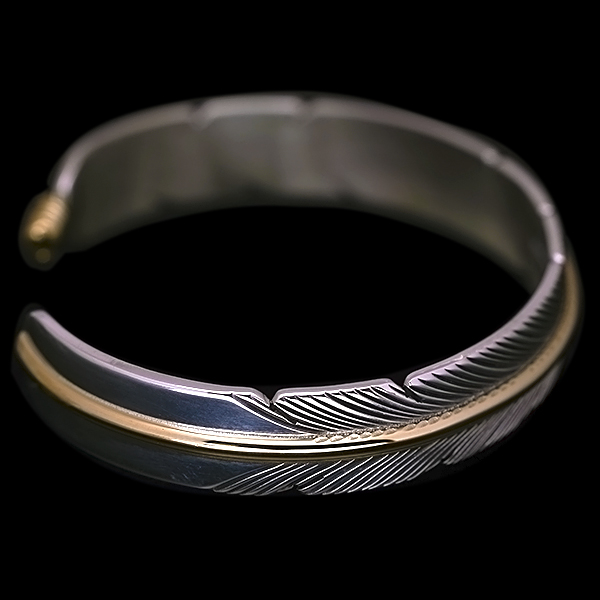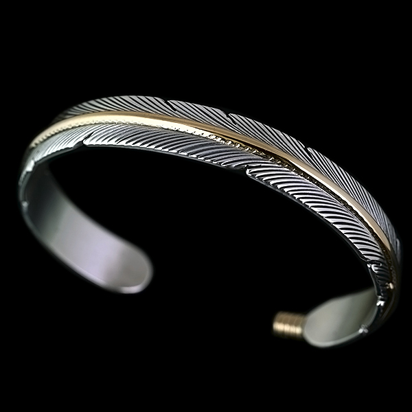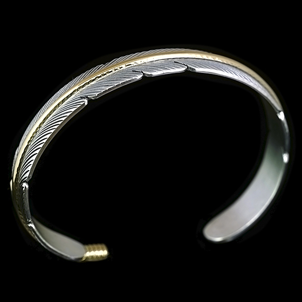 | NAVAJO/ナバホ族のアーティスト Harvey Mace/ハーヴィー・メイスに制作を依頼したバングルです。 躍動感のあるフェザーモチーフの作品です。センターラインは12KGF(12金張り)が入っているため、洗練された落ち着いた魅力があり、シルバーとのバランスも絶妙です。 美しい曲線と共にフェザーがしっかりとデザインされていますので、どなたでもお楽しみ頂けるバングルです。 |