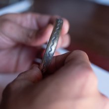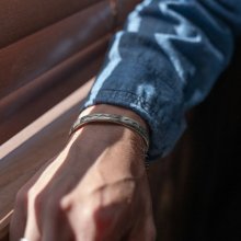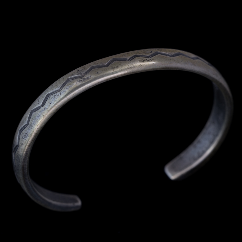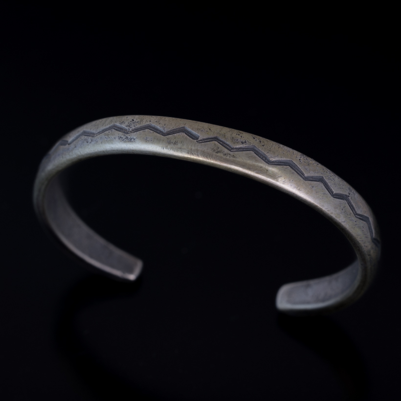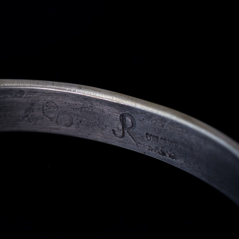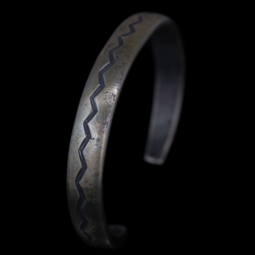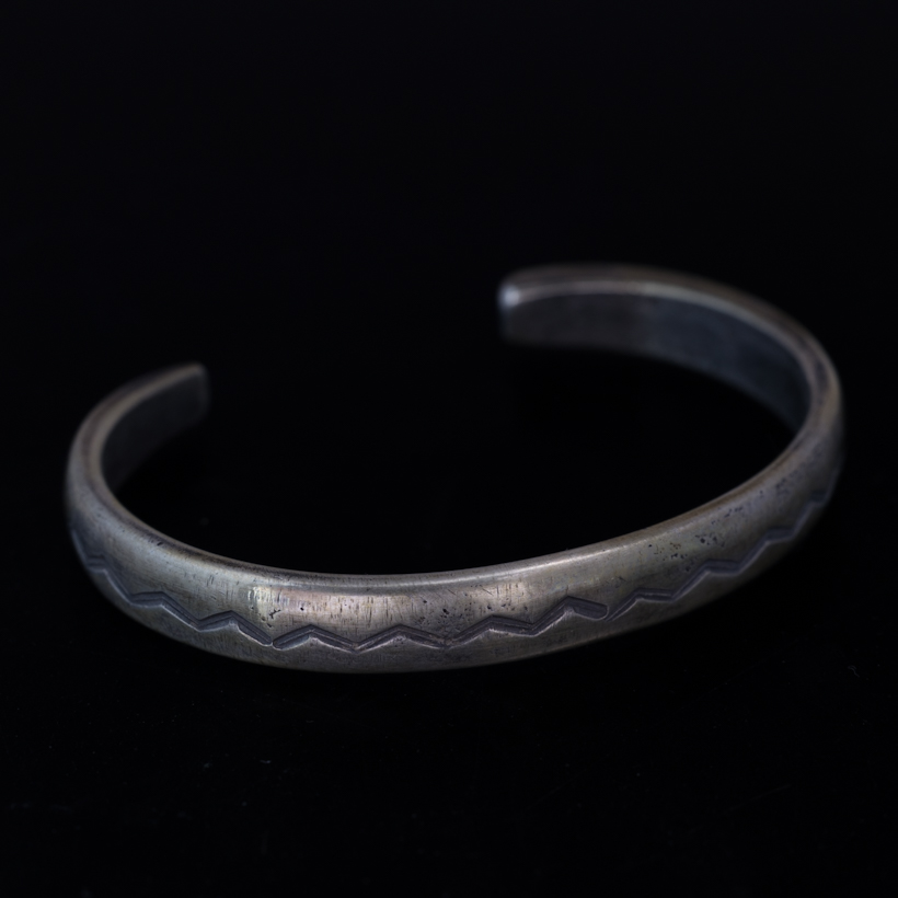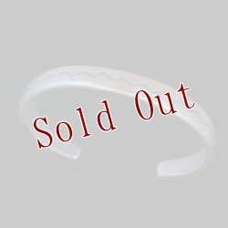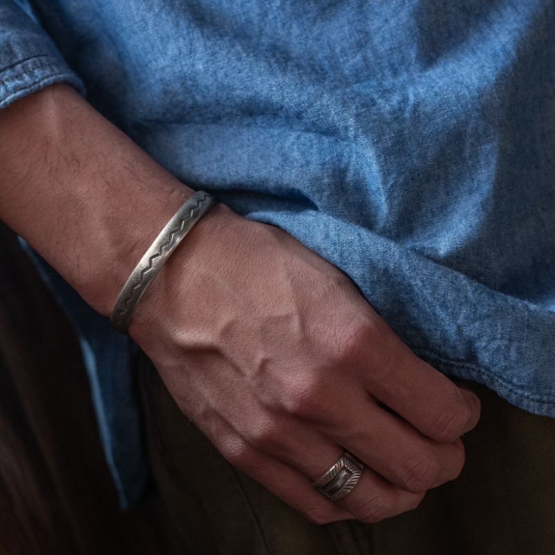 | Creek/クリーク族のアーティスト Jesse Robbins/ジェシー・ロビンズが制作したバングルです。 ハーフラウンド(甲丸)に成形されたコインシルバーによる雰囲気のある作品です。 スタンプワークによるシンプルでベーシックなデザインが印象的です。飽きの来ないスタイルは一本で着けられても良いですし、他のジュエリーと組み合わすことでメインにも脇役にもなる作品です。 年齢に関係なくスタイリングをお楽しみいただける大人のアイテムだと思います。 内周約165mm(開口部含む)になります。着け方にもよりますが手首サイズ約155〜約165mmの方におすすめです。サイズ調整をご希望される場合は事前にご希望のサイズをお知らせください。 |