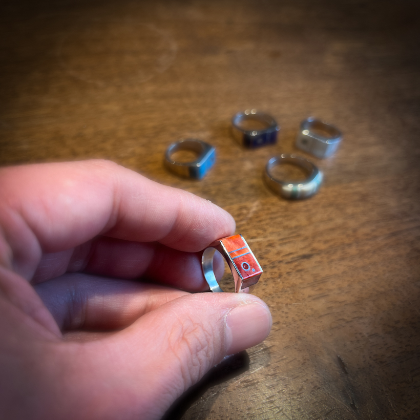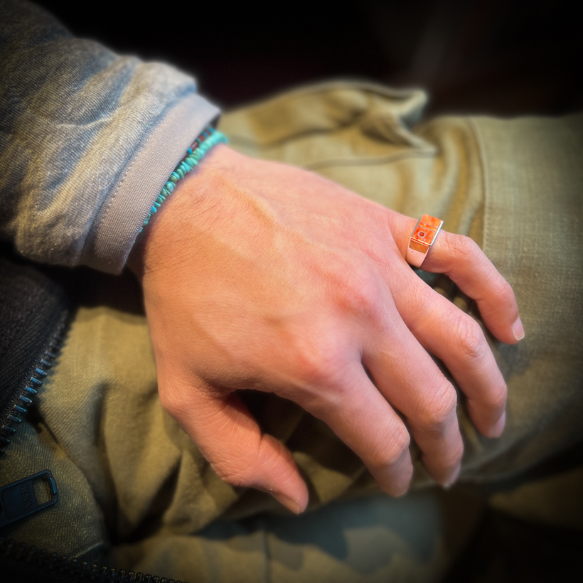 | NAVAJO/ナバホ族のアーティスト Veronica Benally/ベロニカ・ベナリーに制作依頼をしたリングです。 インレイ技法を用いて一つ一つ丁寧にカットしたストーンをセットし表現されています。スパイニーオイスターシェルをベースにワンポイントでコーラル、女性アーティストならではの美しい配色は目を引くだけでなく、自然に洋服に取り入れることできる作品です。 店頭では男女問わず人気ありますので、ペアでもギフトとしても勧めです。 |