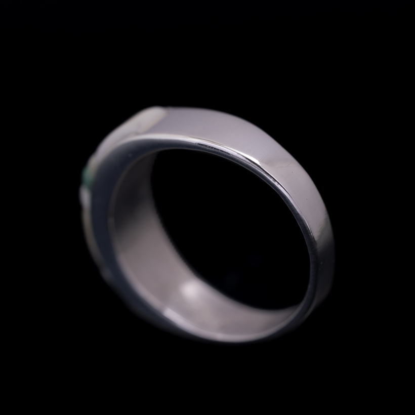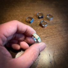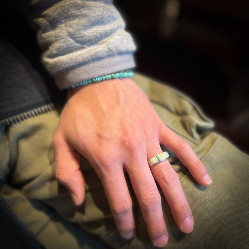 | NAVAJO/ナバホ族のアーティスト Veronica Benally/ベロニカ・ベナリーに制作依頼をしたリングです。 インレイ技法を用いて一つ一つ丁寧にカットしたストーンをセットし表現されています。アイボリーをベースにワンポイントでグリーンカラーのターコイズを散りばめたRIVER MAIL企画によるものです。女性アーティストならではの美しい配色は目を引くだけでなく、自然に洋服に取り入れることできる作品です。 デザインは現代的ですが、ネイティブアメリカンの主食でもあるトウモロコシがイメージされています。 |
