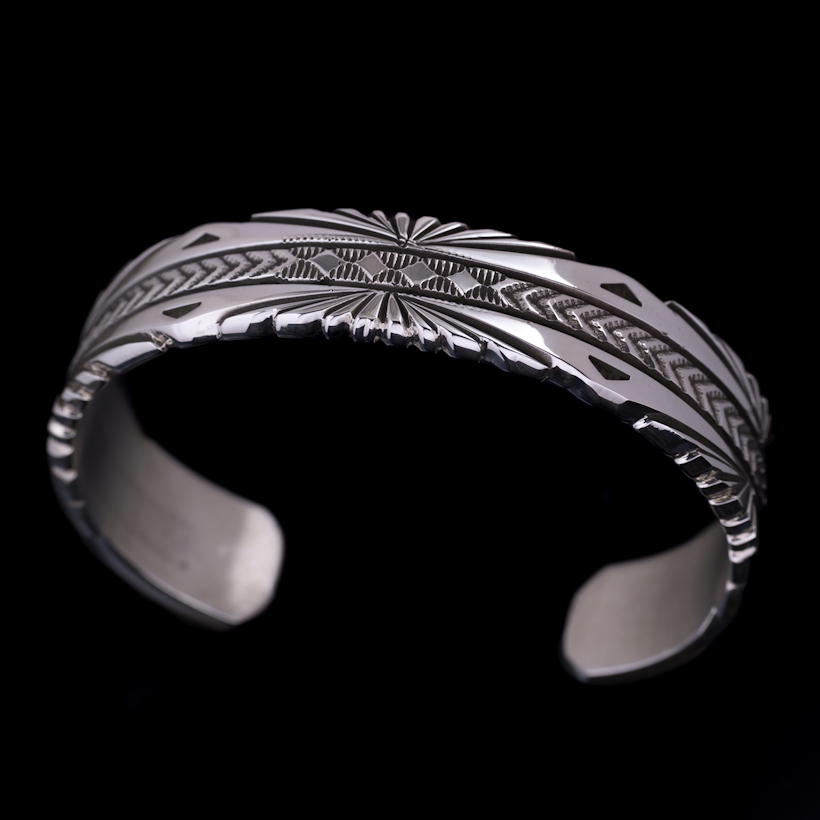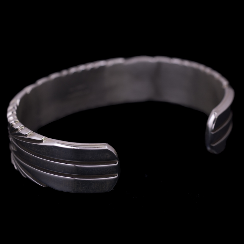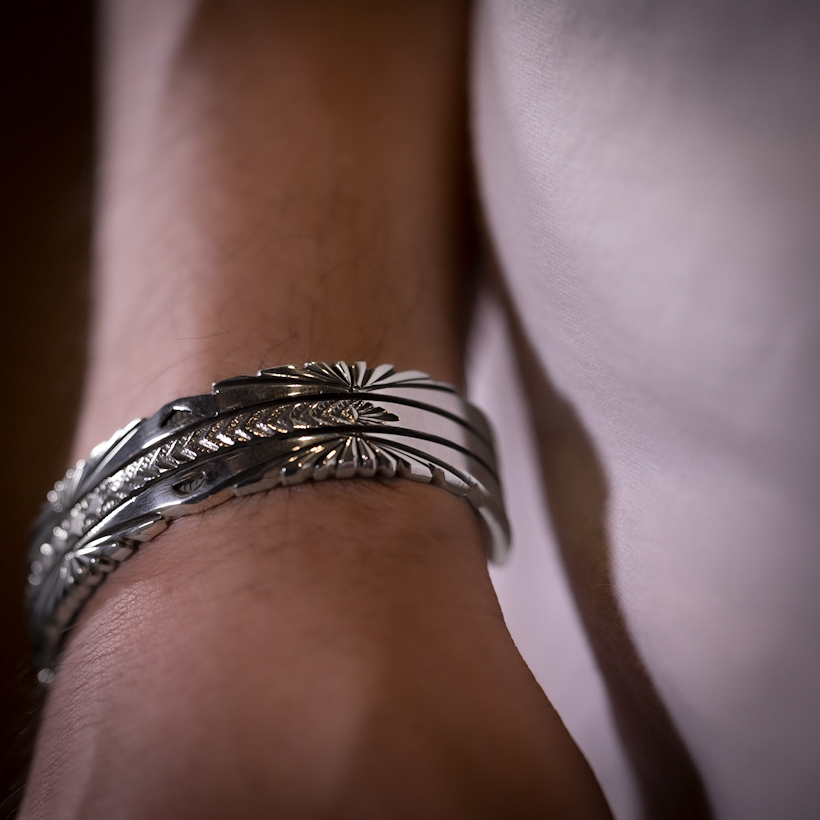 | NAVAJO/ナバホ族のアーティスト Bruce Morgan/ブルース・モーガンに制作を依頼したバングルです。 当店ではお馴染みの4つのダイヤとアローデザインによる作品にサンバーストを意識して取り入れていただきました。また従来使用しているシルバーの板の厚みではなく、重厚感とエッジを際立たせるために厚みをもたせました。幅もしっかりと感じて着用していただけるので、単体でも十分な存在感を得られます。RIVER MAIL企画によるスペシャルな逸品に仕上がっていますので、経年変化と共にお楽しみください。 |