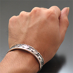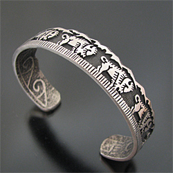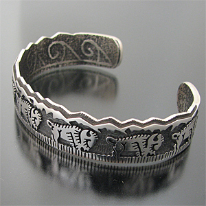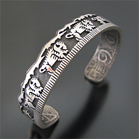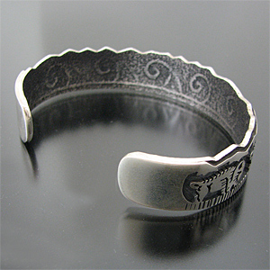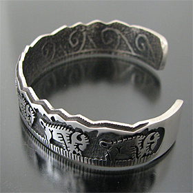 | HOPI/ホピ族の人気アーティスト Gerald Lomaventema/ジェロ・ロマヴェンテマが制作したバングルです。 オーバーレイを用いてジェロが得意とするバッファローのデザインが使用されており、細身でスタイリングしやすい作品に仕上がっております! 裏側にはトゥーファーキャスト技法によって制作しており、軽石を削って模様を刻み、溶かしたシルバーを流し込んで独特の質感を表現しています。 40歳前半のGeraldは現在、数多くのジュエリーショーで活躍し、賞も多数獲得している人気のアーティストです! ※サイズは多少変更が出来ますのでお気軽にお問い合わせくださいませ。 | ||
