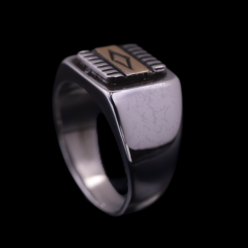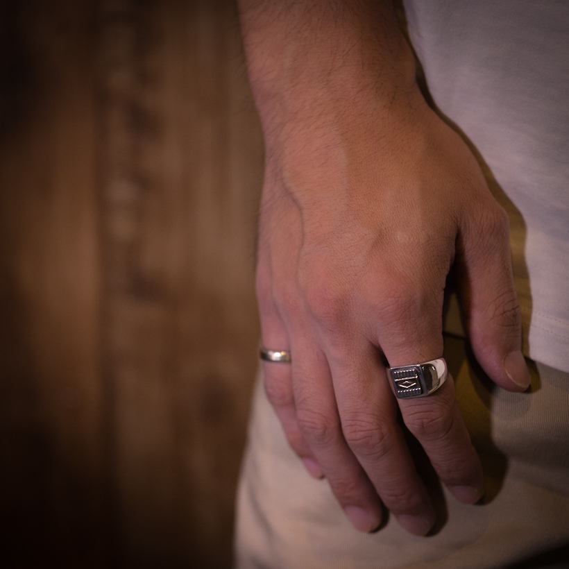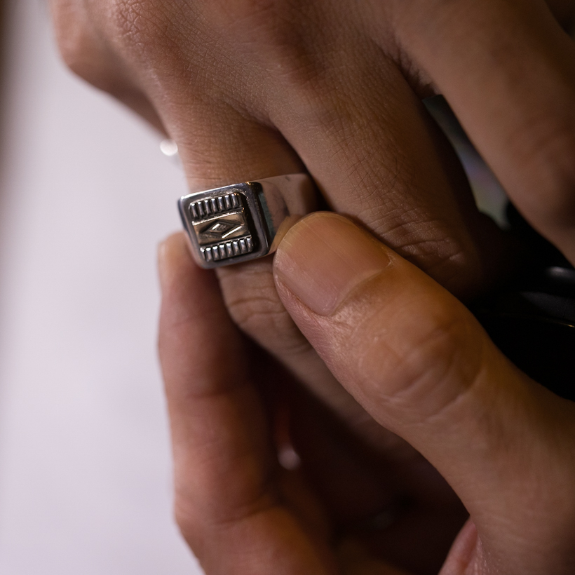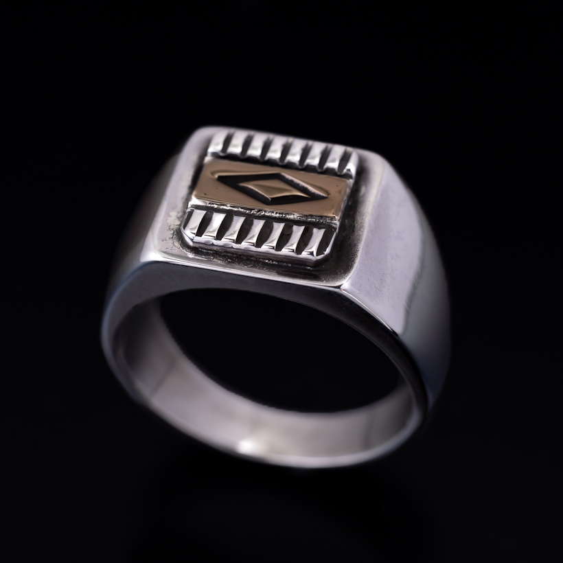 NAVAJO/ナバホ族のアーティスト Bruce Morgan/ブルース・モーガンとのコラボ企画によるリングです。かねてより販売させていただいているRIVER MAILオリジナルのシグネチャー(印台)リングをベースとして、ブルース氏にスクエア型の14Kパーツを制作していただき組み合わせました。特別感のある作品、彼の作品をお持ちの方は安心してスタイリングを楽しんでいただけるのが特徴の一つでもあり、経年変化によるゴールドとシルバーのコントラストがより深みを増していきます。長年の相棒としてぜひお楽しみください。 |