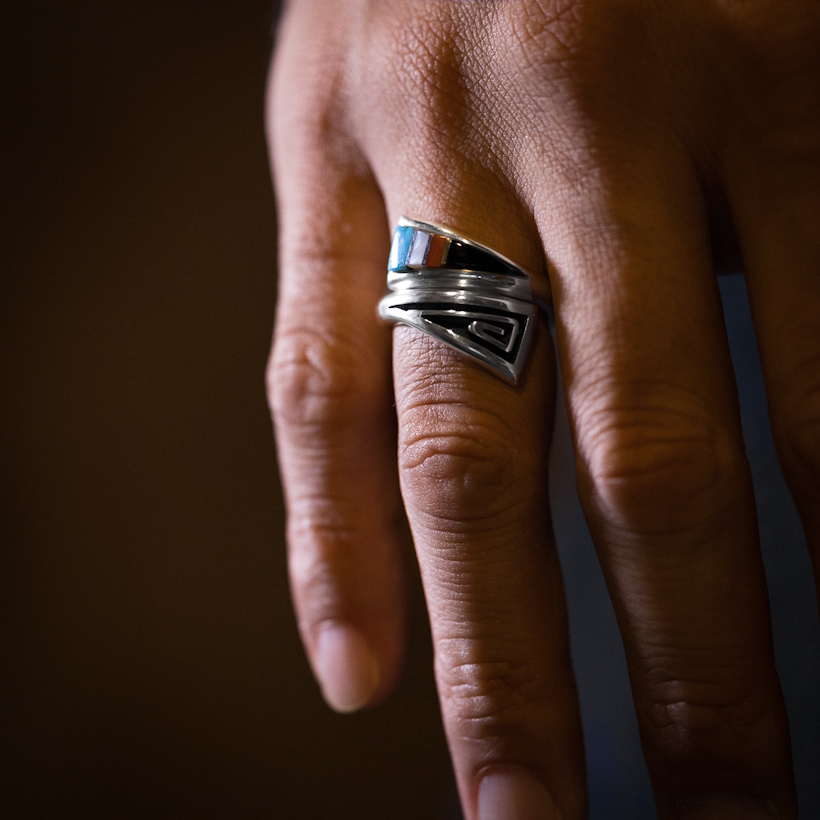 NAVAJO/ナバホ族のアーティスト Albert Nells/アルバート・ネルスに制作を依頼したリングです。過去に賞を受賞した代表的デザインの作品です。4つの石(青、白、赤、黒)は季節、方角、人生を表し、4の数字は彼らにとって縁起のいいものとされています。また彼の自宅からも見えるナバホの神聖な4つの山をイメージされています。ワイヤーワークは一本のワイヤーを曲げてオーバーレイによって制作されており、石の研磨からすべての作業を自身で行っています。長く作り続けている不変のスタイルだからこそ安心感がありますね。スタイルにも取り入れやすいデザイン性と着けた時の納まり具合、上品さも兼ね備えているので大人のジュエリーとしてスタイリングをお楽しみください。 |