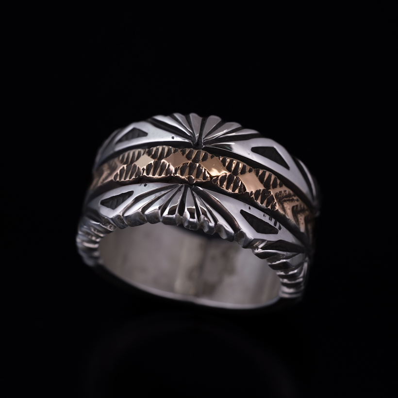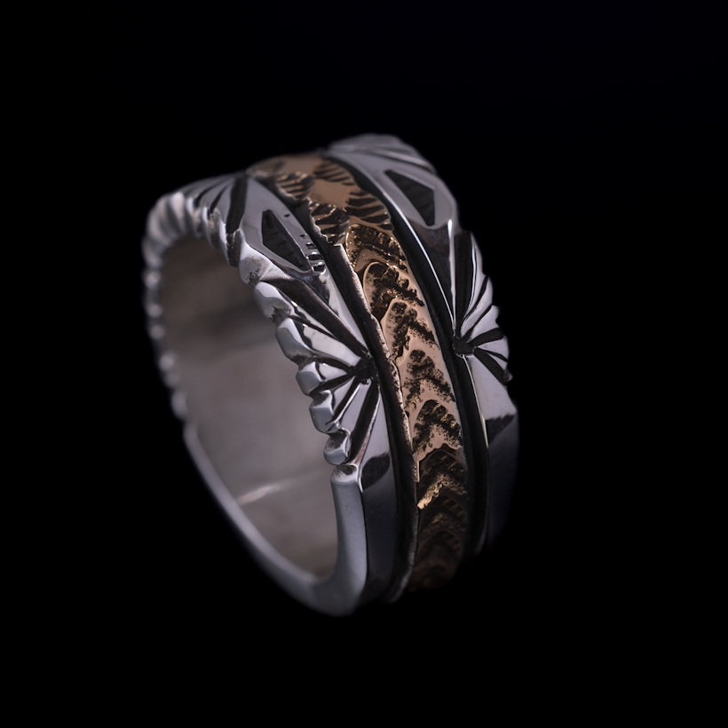 | NAVAJO/ナバホ族のアーティスト Bruce Morgan/ブルース・モーガンに制作を依頼したリングです。シルバーに14Kを組み合わせた作品、ブルース氏の自宅から見えるサンバーストをイメージして取り入れていただき、14Kゴールド部分はRIVER MAIL企画による"4つのダイヤにアロー"を組み合わせたデザインで制作していただきました。(4の数字は縁起のいいものとされており、季節、方角、人生を表しています)またシルバーの厚みは通常使用しているゲージより厚みのあるものをしようしていただきましたので、側面の凹凸や重厚感が得られています。 フォルムはボトムに向かうほど細くなるテーパー付きとなり、着け応えのある12mm幅に厚みがあるのでしっかりと満足感を感じます。シンプルに単体で着けられても品が出ますし、大人のジュエリーとしてスタイリングをお楽しみください。 |
