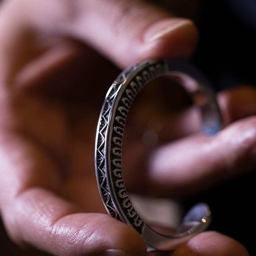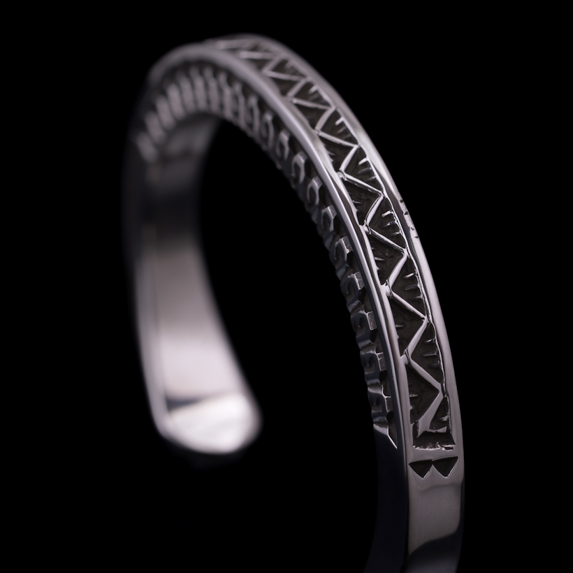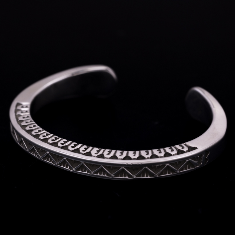 | Navajo/ナバホ族のアーティスト Lyle Secatero/ライル・セカテロに制作を依頼をしたバングルです。厚みのあるスクエアワイヤーを用いて、雷を表すライトニングを挟むかたちで両側面にフェザーを施していただきましたが、等間隔で一つ一つ深く丁寧にスタンプされているのが作品から伝わってきます。エンドはスクエアから形状が変わり平面になり、夕日を表す太陽と雲がデザインされています。ライル氏の世界観がしっかりと感じれていただけるバングルに仕上がっています。スクエアワイヤーを使用した作品は使い勝手の良さが人気の一つでもあり、この厚みは重厚感ともに満足感があります。単体でも十分な存在感が得られますが、重ね着けする際には厚みがありますのでフラットなバングルや形状を変えてトライアングルと組み合わせてスタイルを作り上げる楽しさもあります。使用していくと経年変化による雰囲気が増していきますので、作品自体も引き締まっていきます。ぜひお楽しみください。内周は開口部を含めて140mmほどになりますので、手首サイズ130mm〜140mmの方にお勧めです。+10mmほどはサイズアップする事は可能かと思いますので、ご希望の方は事前にご相談ください。 |