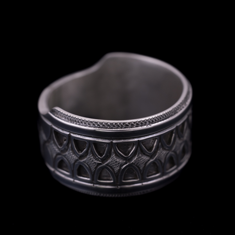 | HOPI/ホピ族のアーティスト Emmett Navakuku/エメット・ナバククに制作を依頼をしたリングです。2枚のシルバーのプレートを用いた伝統的技法オーバーレイによる作品、幅12mmの中に表現された特徴的なデザインはミルキーウェイ(天の川)を表現していただきました。エメット氏の世界観が表現された作品に仕上がっております。シルバー、エングレービングによるグレー、そしてブラックの3色での見せ方は作品に奥行きを持たせ一つ一つの作業に時間をかけて制作されたのが伝わってきます。ボトムは7mmと細くなっているので、指の曲げやすさも確保されています。着用すると単体で着けてもしっかりと主張してくれる太さを感じます。肌あたりもよく、指に馴染む着け心地も満足感があります。使用していくとコントラストがはっきりと効いてくるので、より作品に深みが増していきます。スタイリングと共に経年変化をお楽しみください。 |