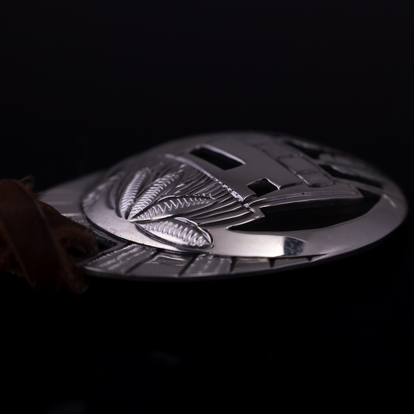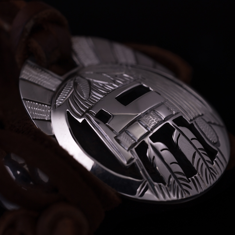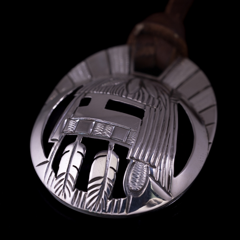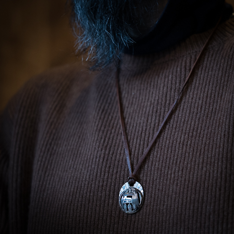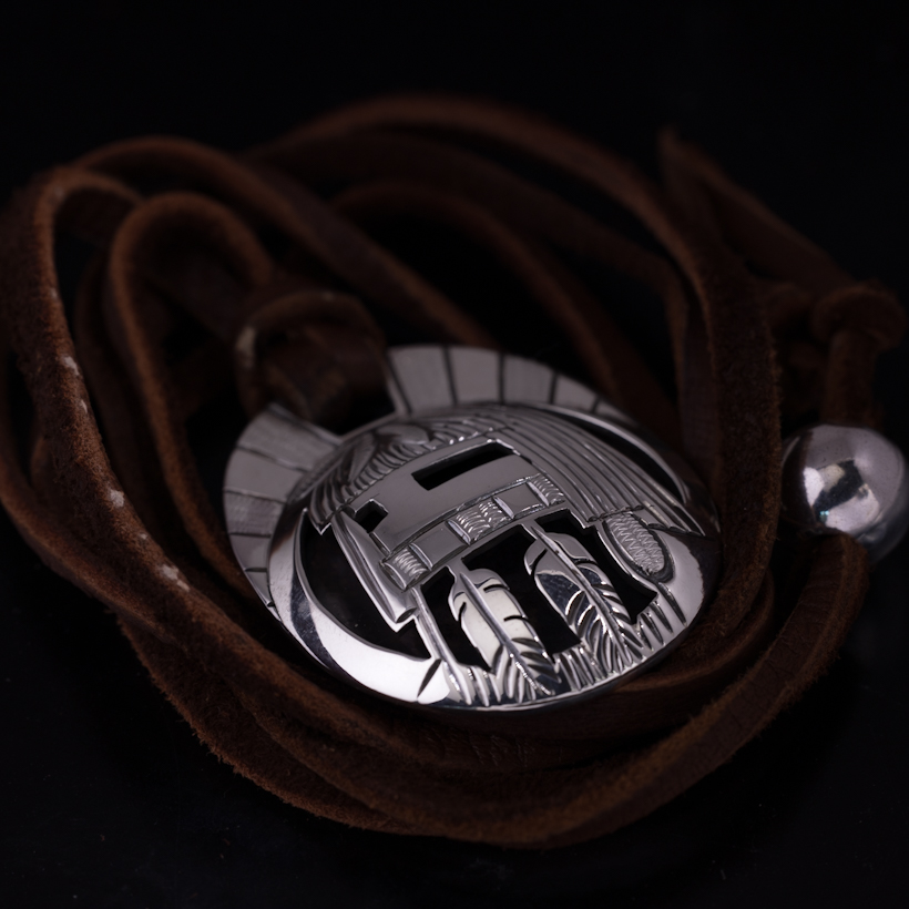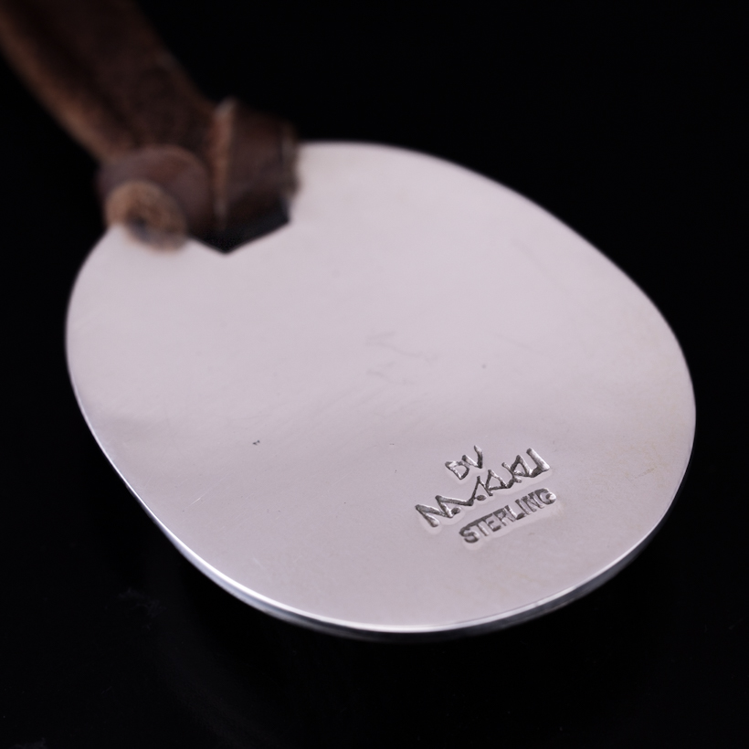 | HOPI/ホピ族のアーティスト Emmett Navakuku/エメット・ナバククに制作を依頼をしたペンダントです。2枚のシルバーのプレートを用いた伝統的技法オーバーレイによる作品、恵みの雨をもたらすロングヘアカチナをデザインしていただきました。その名の通り長い髪と髭が特徴的で、好きな方も多いカチナの一つです。ロングヘアはドーム状の独特の形状で仕上げられているため立体感があり、エメット氏の世界観が表現された作品に仕上がっております。またシルバー、エングレービングによるグレー、そしてブラックの3色での見せ方は作品にメリハリ持たせ、一つ一つの作業に時間をかけて制作されたのが伝わってきます。実際に着けると雰囲気があり、皮ひもをセットしSSビーズでサイズ調整ができるようになっていますので、お好みの長さでスタイリングしていただけます。季節によって着られる服装も変わりますので、長さ調整ができると便利さを感じますね。使用していくと経年変化とともにコントラストがはっきりと効いてくるので、より作品に深みが増していきます。末永くお楽しみいただけたらと思います。 |