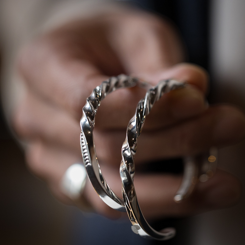 | Navajo/ナバホ族のアーティスト Lyle Secatero/ライル・セカテロに制作を依頼をした当店企画によるバングルです。幅、厚みとも約4mmのスクエアワイヤーを用いて、雷を表すライトニングを1面に入れていただ、見る角度で表情に変化が出るように捻りを加えていただくようにお願いしました。エンドはスクエアから平面に形状が変わり、見た目では分からない安定感のある着け心地が得られています。ライル氏の世界観がしっかりと感じていただけるバングルに仕上がっています。 スクエアワイヤーを使用した作品は使い勝手の良さが人気の一つでもあり、この丁度よい厚みはスタイリングのしやすさが抜群です。単体でシンプルに着けるのもいいですし、脇役としてフラットなバングルや形状を変えてトライアングルと組み合わせてスタイルを作り上げるのもいいですね。また鏡面仕上げのしっかりと磨きが掛かった美しい光沢は使用していくと経年変化による雰囲気が増していきます。インディアンジュエリー好きはもちろん、服好きなら一本は持っておきたいユーティリティーアイテムですね。 サイズは手首から+10mmまでの内周(開口部を含む)がお勧めになりますのでご参考にしてください。(例:手首160mmですと5 3/4がお勧めのサイズになります)±5mmほどはサイズ調整も可能ですので、サイズでお悩みでしたら事前にご相談ください。 |