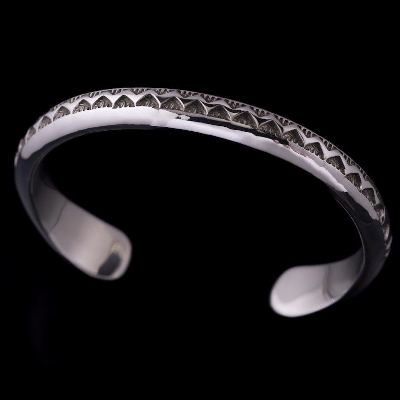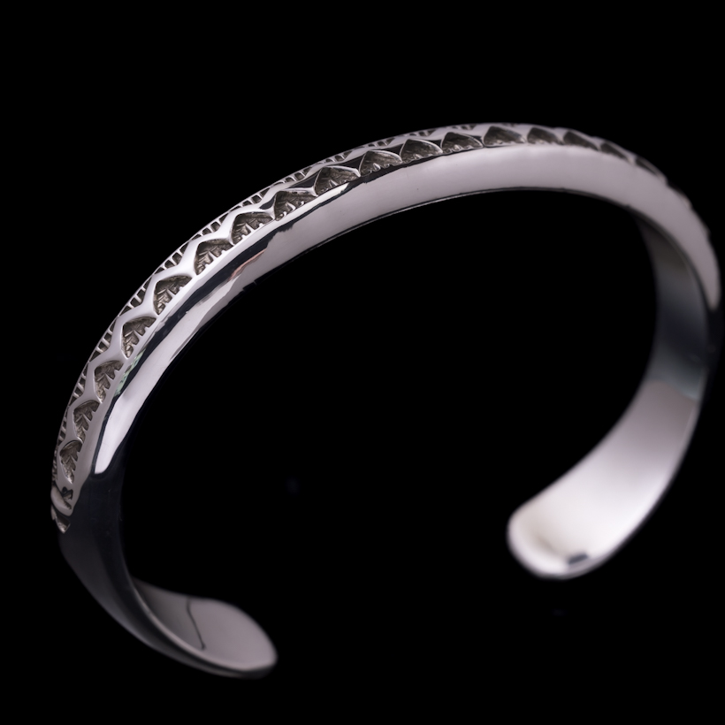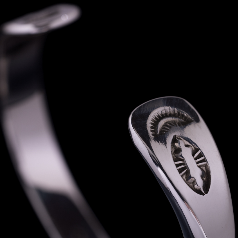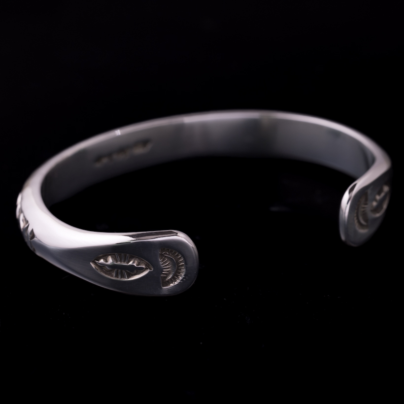 | Navajo/ナバホ族のアーティスト Lyle Secatero/ライル・セカテロに制作を依頼をしたバングルです。幅、太さ、重さともに販売されているハーフラウンドワイヤーで最もヘビーな#0ゲージを使用していただきました。デザインは雷を表すライトニング、平面にスタンプを打つわけではなく曲面にスタンプをしていくので、技術もそうですがずれないように打つ集中力が必要なため、より丁寧な仕事が要求されます。スクエア、トライアングルとそれぞれの良さがありますが、ハーフラウンドの柔らかい雰囲気は他の形状にはない良さがありますね。エンドはハーフラウンドから形状が変わり平面になり、夕日を表す太陽と雲がデザインされています。平面になっているのはデザインもそうですが、着けたときのフォールド感がアップし着け心地の良さをさらに感じます。 トライアングル、スクエアと比べると見かけることが少ないハーフラウンド、実際に着けてみるとその納まり具合、スタイリングのしやすさは初めてバングルを着けられる方でも違和感がなく満足感を感じていただけると思います。使い勝手の良さは間違いないですね。単体でも十分な存在感が得られますが、重ね着けしたくなるこの形状、フラット、トライアングル、スクエアと合わせて...使用していくと経年変化による雰囲気も増していきますので、作品自体もさらに引き締まっていきます。ぜひお楽しみください。内周は開口部を含めて167mmほどになりますので、手首サイズ157mm〜167mmの方にお勧めです。±5mmほどはサイズ調整可能かと思いますので、ご希望の方は事前にご相談ください。 |