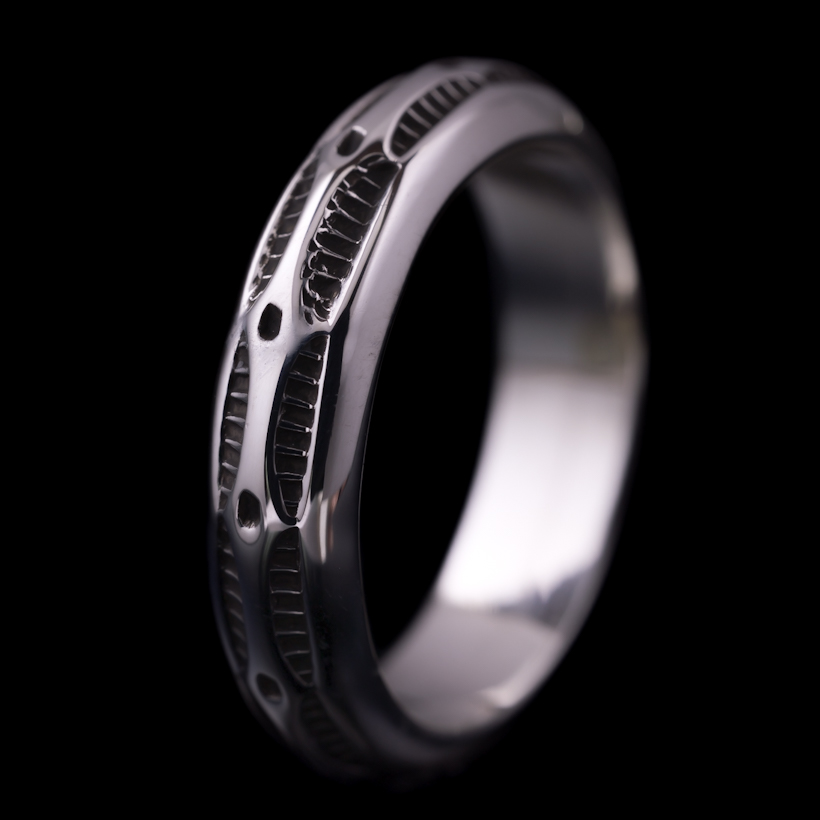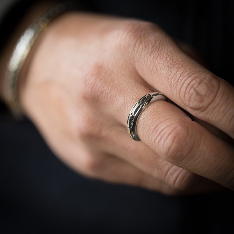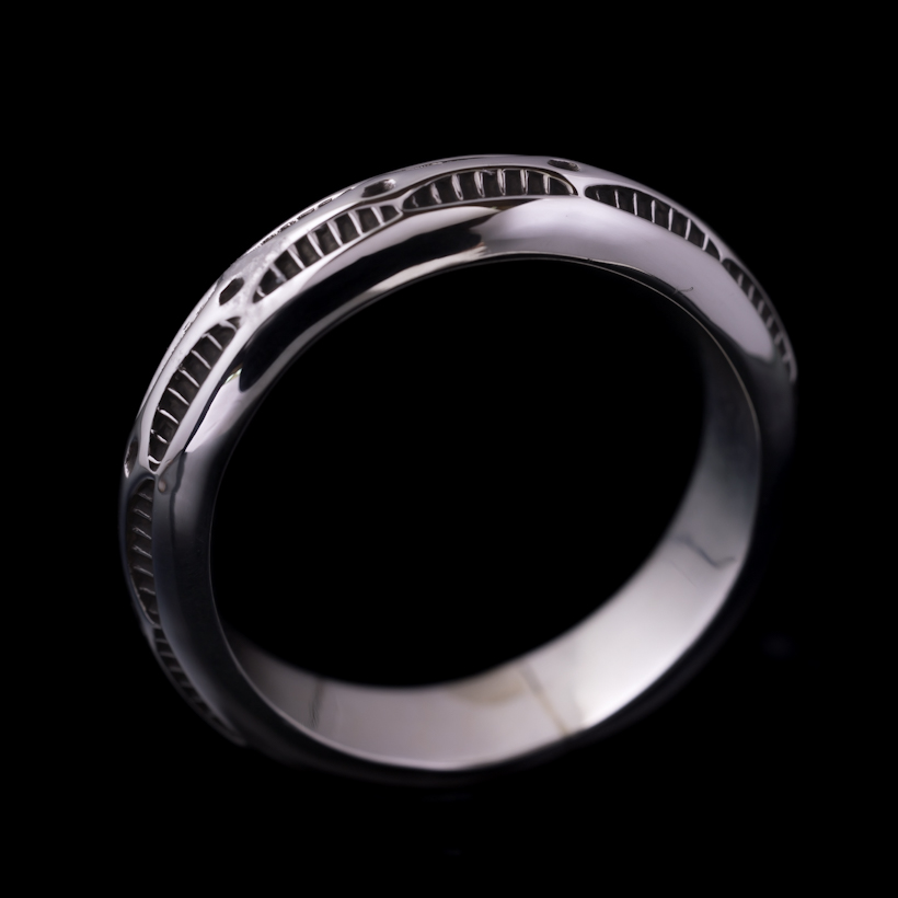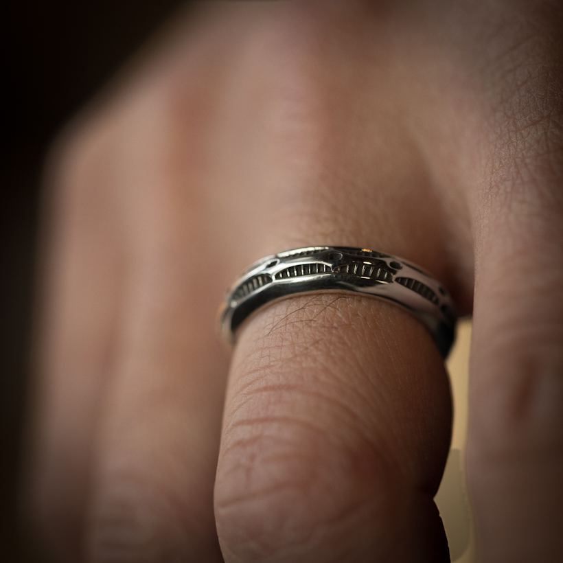 | Navajo/ナバホ族のアーティスト Lyle Secatero/ライル・セカテロに制作を依頼をしたリングです。幅、太さ、重さともにリングにちょうど良い#4ハーフラウンドワイヤーを使用していただきました。デザインは太陽と雲の空を表現しています。平面にスタンプを打つわけではなく曲面にスタンプをしていくので、技術もそうですがずれないように打つ集中力が必要なため、より丁寧な仕事が要求されます。スクエア、トライアングルとそれぞれの良さがありますが、ハーフラウンドの柔らかい雰囲気は他の形状にはない良さがありますね。 実際に着けてみるとその納まり具合、スタイリングのしやすさは初めてリングを着けられる方でも違和感がなく、満足感を感じていただけると思います。シンプルですがボリューム感があるので物足りなさも感じず、使い勝手の良さは間違いないですね。個性的な作品もいいですが、日常使いに気軽に取り入れていただきたいと思います。"いつも身に着けておきたい"と思えるそんなリングをイメージしました。 |