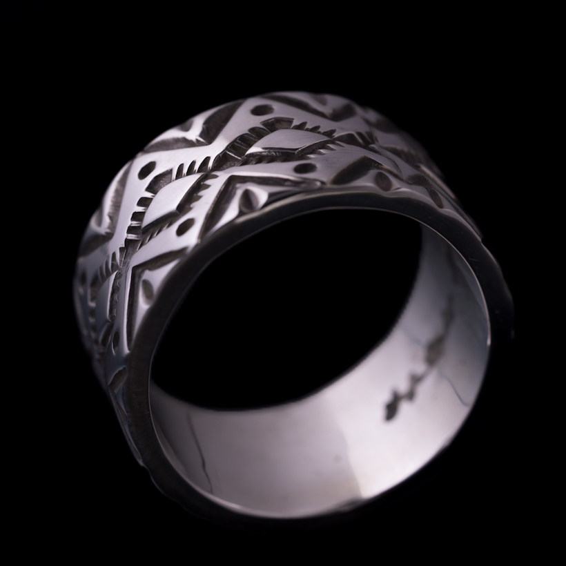 | Navajo/ナバホ族のアーティスト Lyle Secatero/ライル・セカテロに制作を依頼をした当店企画のリングです。14gaの厚み用いて、メインとして活躍してくれる10mm幅にスタンプを施していただき、通常ハーフスタンプになるところを一周スタンプを入れていただきました。一つ一つ深く丁寧にスタンピングされたデザインは太陽と山を表現しており、ナバホの伝統的でデザインの一つでもあり自然への畏敬の象徴とされています。 ベーシックなバンドリングはスタイルには欠かせないアイテムになります。実際に着けてみるとその納まり具合、スタイリングのしやすさは初めてリングを着けられる方でも違和感がなく、満足感を感じていただけると思います。幅もあるので物足りなさも感じず、使い勝手の良さは間違いないですね。個性的な作品もいいですが、日常使いに気軽に取り入れていただけると思います。経年変化とともにお楽しみください。 |