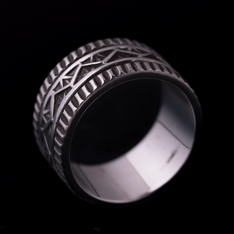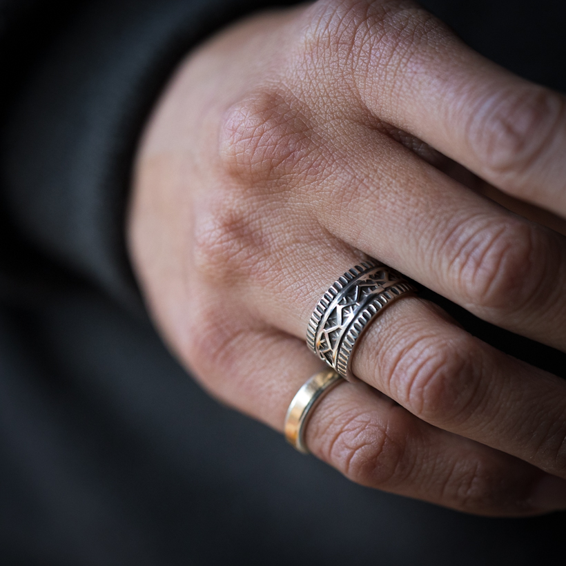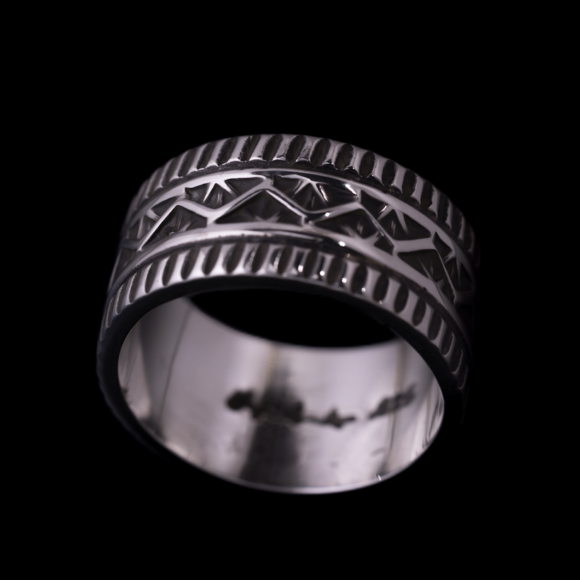 | Navajo/ナバホ族のアーティスト Lyle Secatero/ライル・セカテロに制作を依頼をした当店企画のリングです。14gaの厚み用いて、メインとして活躍してくれる10mm幅にスタンプを施していただき、通常ハーフスタンプになるところを一周スタンプを入れていただきました。一つ一つ深く丁寧にスタンピングされたデザインは稲妻を表すライトニング、ナバホの伝統的でデザインの一つでもあり"恵みの雨と疾さ"を表しており、とされており自然への畏敬の象徴とされている。 ベーシックなバンドリングはスタイルには欠かせないアイテムになります。実際に着けてみるとその納まり具合、スタイリングのしやすさは初めてリングを着けられる方でも違和感がなく、満足感を感じていただけると思います。幅もあるので物足りなさも感じず、使い勝手の良さは間違いないですね。個性的な作品もいいですが、日常使いに気軽に取り入れていただけると思います。経年変化とともにお楽しみください。 |