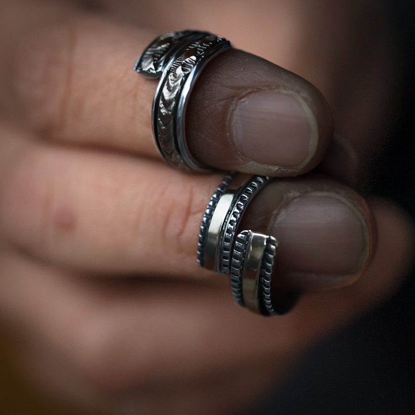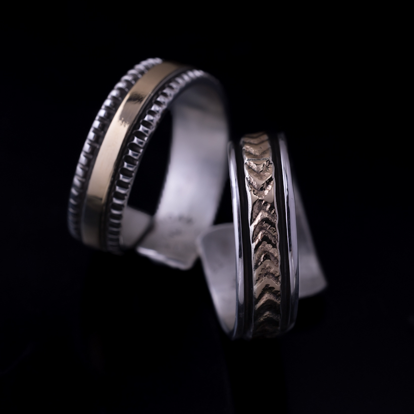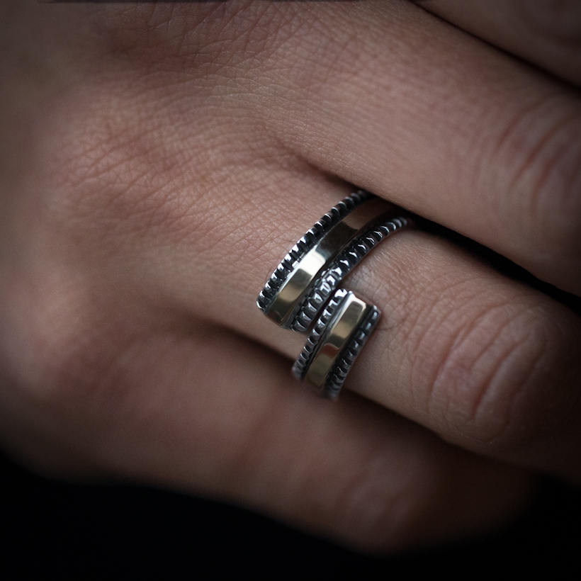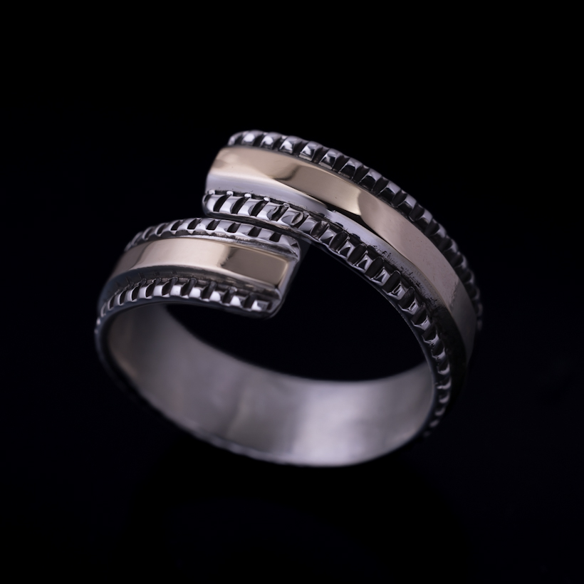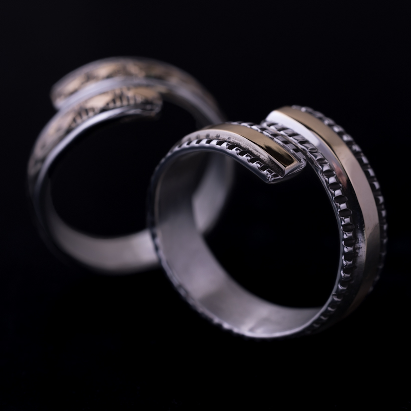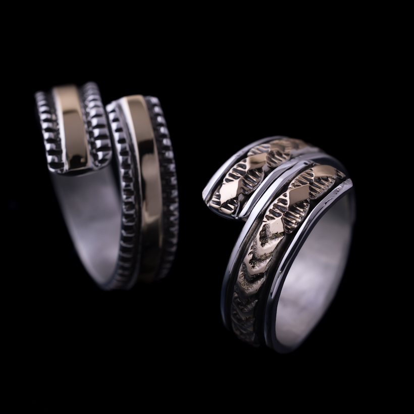 | NAVAJO/ナバホ族のアーティスト Bruce Morgan/ブルース・モーガンに制作を依頼をしたRIVER MAIL企画によるアジャスタブルリングです。シルバーに14Kゴールドを組み合わせた作品に、伝統的スタイルのチゼルワークと呼ばれるタガネ(鉄の先を鋭く削ったノミ、彫刻刀のようなもの)を用いて仕上げていただきました。最もシンプルでクリーンな印象、素材の良さが際立つ長年人気のあるデザインです。 金と銀のコンビリングですが、落ち着いた色味といやらしさのない上品な雰囲気、シンプルですが交差すること主張感も出ていますので、シンプルに単体でつけられてもバランスの良さが際立ちます。多少のサイズ調整が出来るようにロウ付けは行っておりません。調整をご希望される場合は事前にお問合せください。 |