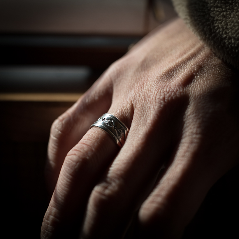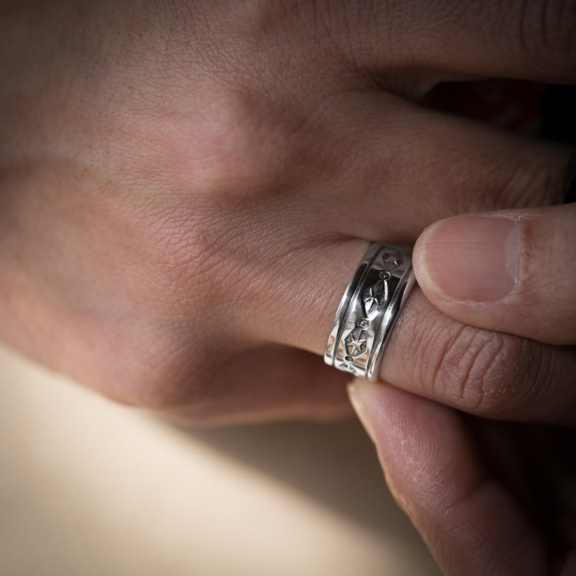 | NAVAJO/ナバホ族のアーティスト Tanya Mace/ターニャ・メイスに制作を依頼したリングです。フェザーのイメージが強いMaceファミリーですが、ナバホジュエリーらしいベーシックなスタンプリングで仕上げていただきました。光沢の美しいクリーンで見慣れた感があり、スタイリングのしやすさには安心感があります。 着けた印象としては普段リングを着けられない方でも自然な感じで取り入れていただきやすい作品だと思います。太すぎない幅は物足りなさも感じさせず丁度よいバランスです。デザイン自体に派手さはないので他のジュエリーとの組み合わせも相性よくスタイリングつくりが楽しめますね。 |