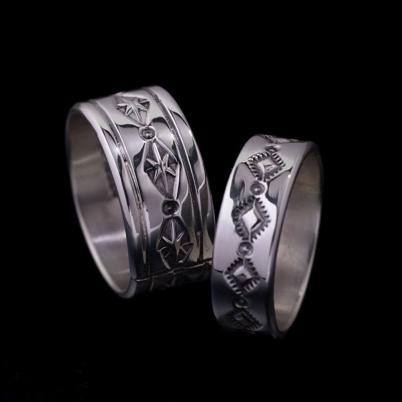 | NAVAJO/ナバホ族のアーティスト Tanya Mace/ターニャ・メイスに制作を依頼したリングです。フェザーのイメージが強いMaceファミリーですが、ナバホジュエリーらしいベーシックなスタンプリングで仕上げていただきました。光沢の美しいクリーンで見慣れた感があり、スタイリングのしやすさには安心感があります。 着けた印象としては普段リングを着けられない方でも自然な感じで取り入れていただきやすい作品だと思います。太すぎない幅は物足りなさも感じさせず丁度よいバランスです。デザイン自体に派手さはないので他のジュエリーとの組み合わせも相性よくスタイリングつくりが楽しめますね。 |