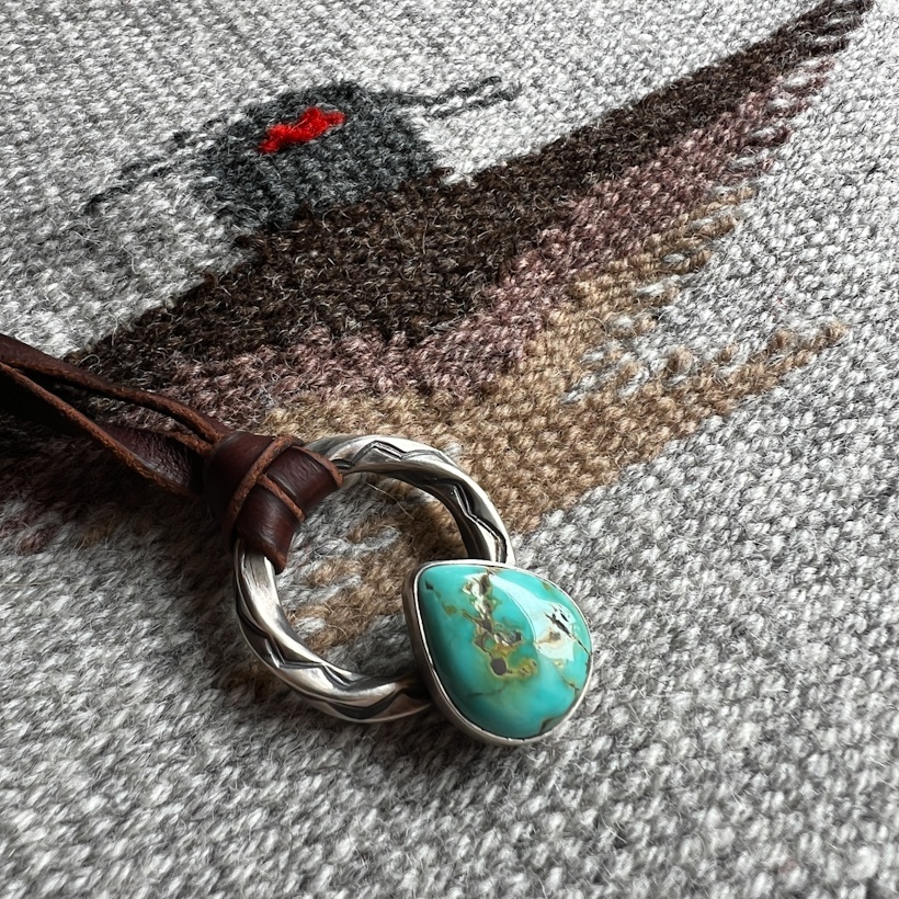 | Creek/クリーク族のアーティスト Jesse Robbins/ジェシー・ロビンズに制作を依頼したペンダントです。コインシルバーによる独特の風合いにティアドロップ型の優しい色味のロイストーンをセットしていただいたトラベラーペンダント、こちらはグラスホルダーとしてもご活用していただける作品です。また捻りを加えたツイストタイプですが、適度な捻り具合が見た目を柔らかくしてくれる印象です。革紐はビーズを絞って長さ調整が可能、主張しすぎないバランスがスタイリングの幅を広げてくれますね。旅好きのジェシー氏ならでは発想と実用性を兼ね備えたアイテム、経年変化とともにぜひお楽しみください。 |