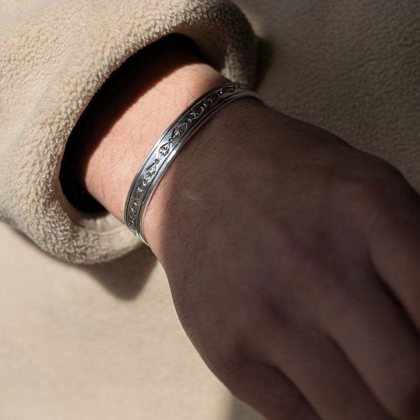 | NAVAJO/ナバホ族のアーティスト Tanya Mace/ターニャ・メイスに制作を依頼したバングルです。フェザーのイメージが強いMaceファミリーですが、ナバホジュエリーらしいベーシックなスタンプバングルで仕上げていただきました。光沢の美しいクリーンで安心感のあるスタイル、経年変化もしっかりと楽しんでいただけるアイテムです。着けた印象としては普段バングルを着けられない方でも自然な感じで取り入れていただきやすい作品だと思います。太すぎない幅は物足りなさも感じさせず丁度よいバランスです。デザイン自体に派手さはないので他のジュエリーとの重ね着けにも相性よくスタイリングつくりが楽しめる印象です。 |
