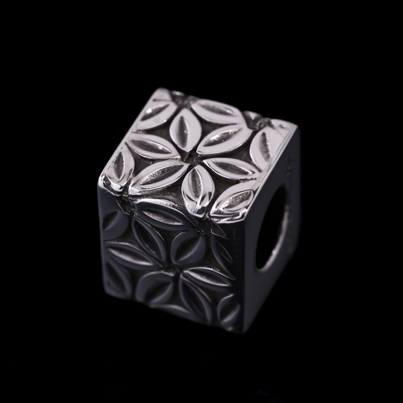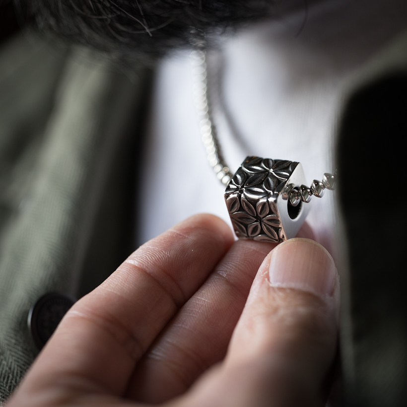 | Navajo/ナバホ族のアーティスト Lyle Secatero/ライル・セカテロに制作を依頼をした当店企画によるペンダントです。6枚の正方形のシルバーのプレートを組み立てて、キューブに仕立てた作品になります。デザインはライル氏が家族と共にガーデニングをしている際に思いついたフラワーになり、直接チェーンを通せるようにチェーンホールを設け一体型にしていただきました。 コロンとした可愛らしい立体感のあるフォルムに主張感を忘れずにしっかりと感じる着用感です。チェーンホールは約7mmほどありますので、ナバホパールなどのビーズチェーンとの相性が良く、存在感のあるチェーンを着けていただいてもチェーン負けしないサイズ感を兼ね備えています。その他にレザーコード、太めのチェーンと合わせてスタイリングお楽しみください。 |