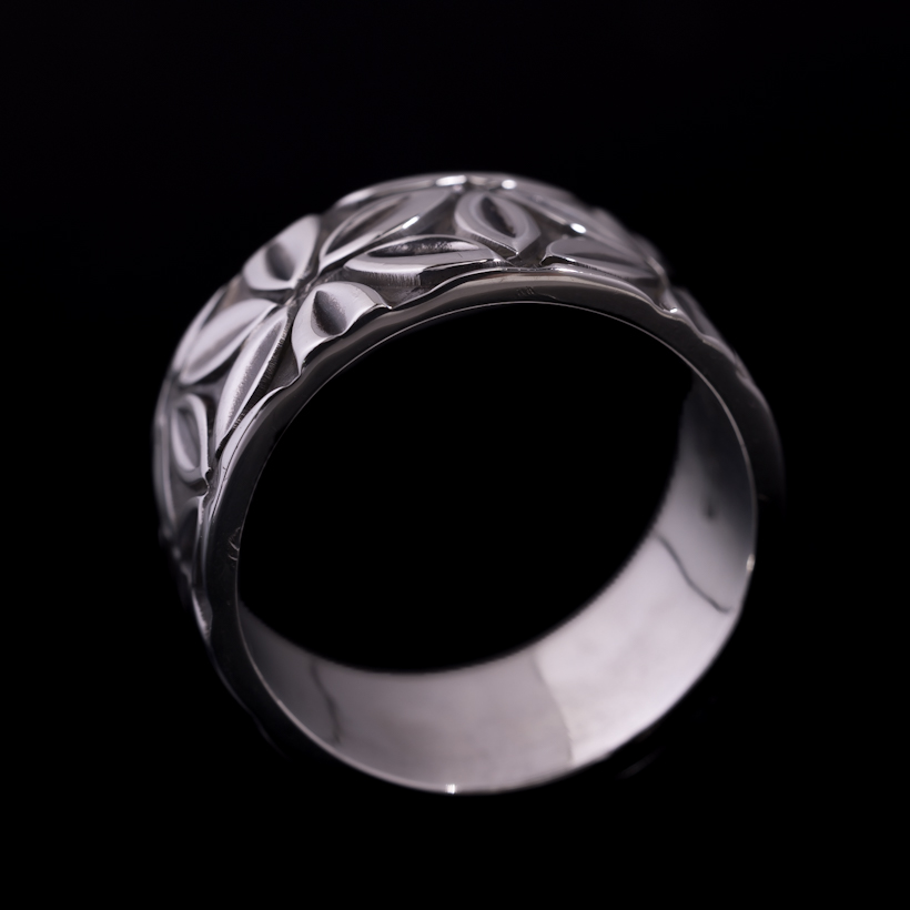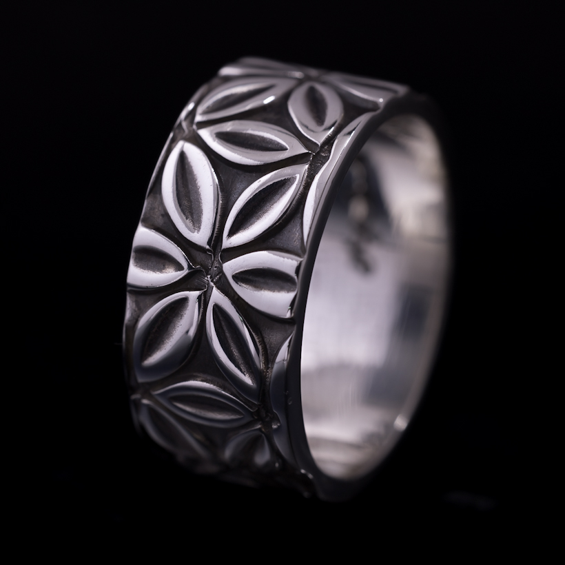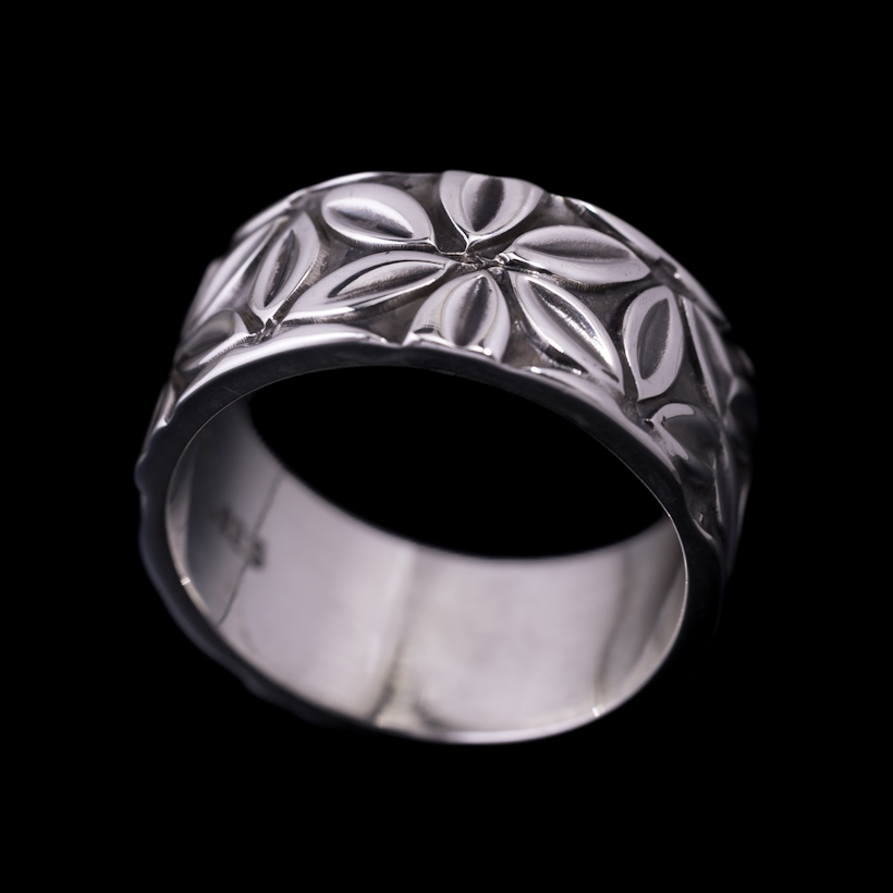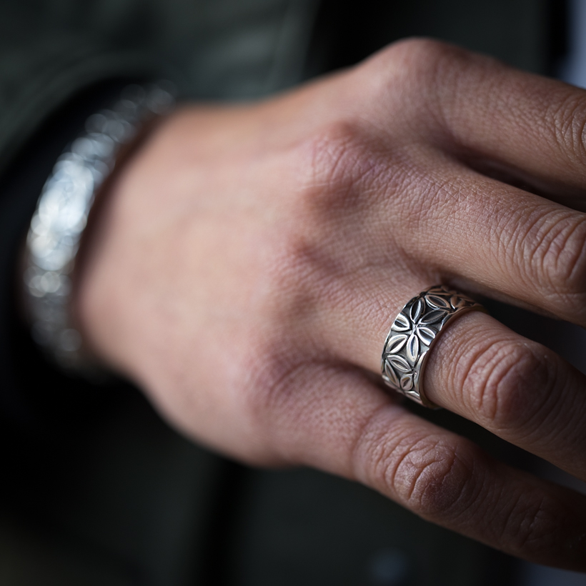 | Navajo/ナバホ族のアーティスト Lyle Secatero/ライル・セカテロに制作を依頼をしたリングです。14gaの厚み用いて、9mm幅にライル氏が家族と共にガーデニングをしている際に思いついたフラワーデザインを全面にスタンプで施していただきました。 ベーシックなバンドリングはスタイルには欠かせないアイテムになります。実際に着けてみるとその納まり具合、スタイリングのしやすさは初めてリングを着けられる方でも違和感がなく、満足感を感じていただけると思います。幅もあるので物足りなさも感じず、使い勝手の良さは間違いないですね。個性的な作品もいいですが、日常使いに気軽に取り入れていただけると思います。経年変化とともにお楽しみください。 |