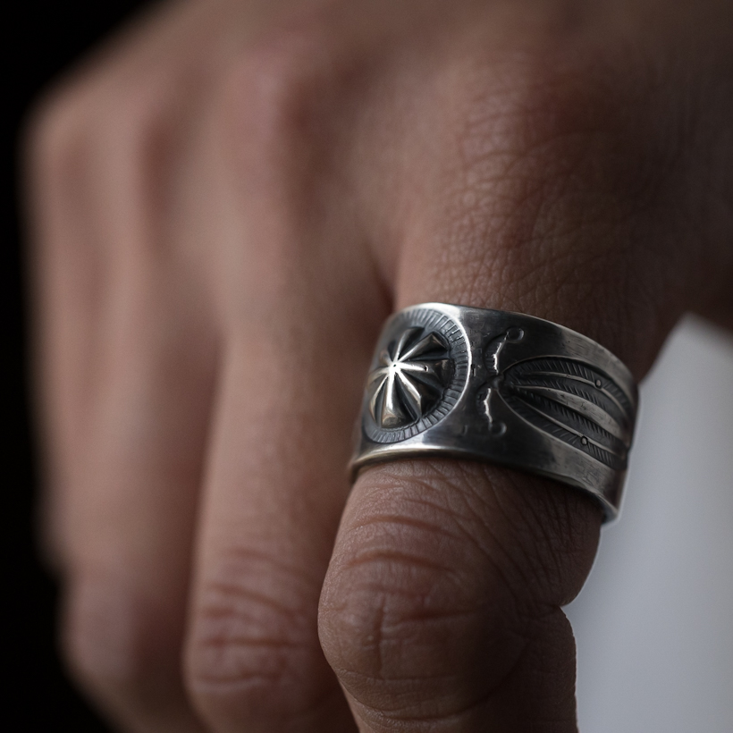 | Creek/クリーク族のアーティスト Jesse Robbins/ジェシー・ロビンズが制作したリングです。鈍い質感を出した雰囲気のある作品、無骨で男らしさを感じます。古い銀貨を溶かして作られていますが、何とも言えない味わい深いリング、クラシックジュエリーのすべてがつまっているかのような仕上がりですね。年齢を重ねると共に深みを増すリングなので、いつも身に着けるアイテムの一つとして飽きることなくお楽しみいただければ幸いです。 スタイリングは単体でさりげなく着けられるのもシンプルで大人の楽しみ方だと思います。もちろんお持ちのジュエリーとの相性も考えながら組合すのもこのリングの面白みがありますね。経年変化とともに末永くご愛用していただければと思います。 |