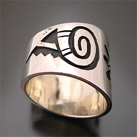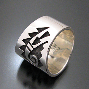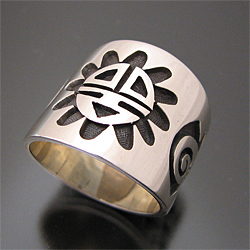 | HOPI/ホピ族のアーティスト Mitchell Sockyma/ミッチェル・ソッキーマが制作したリングです。 オーバーレイ技法を用いて、人気のサンフェイスがデザインされており、スタイリッシュなフォルムでシルバーの良さが前面に引き出されている見事な作品に仕上がっています。 太陽は万物の創造主で絶対神。厳密には遠い宇宙にいる神が人間の暮らしを見守るための窓だと云われています。 Mitchell Sockymaは1972年からシルバーワークを開始したホピ族のベテランアーティストで、アーティストならではの個性が存分に感じられる素晴らしい作品です! | ||