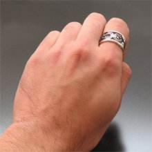 | HOPI/ホピ族のアーティストが制作したリングです。 オーバーレイ技法を用いて、人気のスパイダー(蜘蛛)がデザインされており、サイドにはビレッジ・羽根を2本立てた『プレイヤーフェザー/パホ』のモチーフが使われています! ホピの伝説に因れば、蜘蛛は赤土と自分の出す糸とを混ぜあわせて人間を作ったと云われており、『創造性』や『独創性』を意味し、人間の副創造主を表しています。 | ||