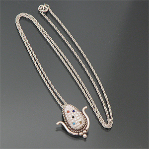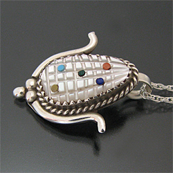 | ZUNI/ズニ族が制作したコーンモチーフのネックレスです! マザーオブパールをベースに、ターコイズ、ラピス、コーラル、マラカイトが組み合わされています! コーンが忠実に表現されている、とても可愛らしい作品に仕上がっており、スタイリングしやすい大きさなので、様々なファッションにご活用いただけます! | ||