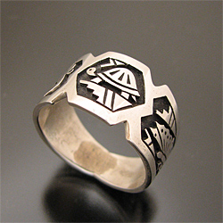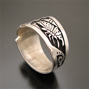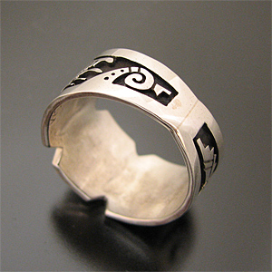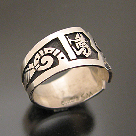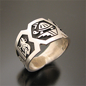 | こちらは賞を獲得しているHOPI/ホピ族の人気アーティスト Sparky Masawytewa/スパーキー・マサワィテワが制作したリングです。 オーバーレイを用いてタートル(亀)がデザインされており、両サイドにはフロッグ(蛙)、バタフライ(蝶)と人気のモチーフの組み合わせで、とても可愛い仕上がりとなっています! スタイリングしやすいリング幅で、違和感なくお使い頂けます! スパーキーならではのセンスとユーモアーのある仕上がりとなっています! | ||