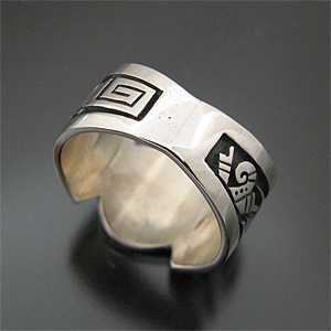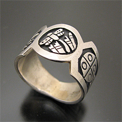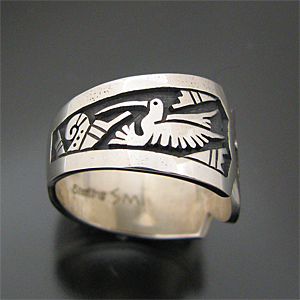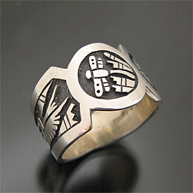 | こちらは賞を獲得しているHOPI/ホピ族の人気アーティスト Sparky Masawytewa/スパーキー・マサワィテワが制作したリングです。 オーバーレイを用いて、珍しいモチーフドラゴンフライ(トンボ)がデザインされており、両サイドにはパホ(プレイヤーフェザー)、ハミングバード(ハチドリ)と人気のモチーフの組み合わせで、とても可愛い仕上がりとなっています! スタイリングしやすいリング幅で、違和感なくお使い頂けます! スパーキーならではのセンスとユーモアーのある仕上がりとなっています! | ||