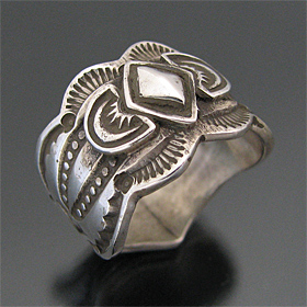 | 賞も獲得しているNAVAJO/ナバホ族の人気アーティスト Sunshine Reeves/サンシャイン・リーブスが制作したリングです。 アーティストの得意とする奥深いスタンプワークが巧みに施されており、シンプルながら圧倒的な存在感をお楽しみ頂ける逸品です! また、男女問わずスタイリングしやすく、存在感のある大きさが魅力的です♪ ナバホを代表するスタンプワークの名手。細かく、美しく繊細なデザインが特徴で、インディアンジュエリーのショーの中でも権威のあるサンタフェインディアンマーケットやギャラップなどでの賞を多数獲得しているナバホを代表するトップアーティストの一人です。 | ||