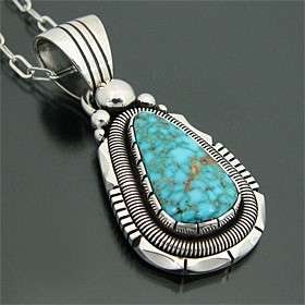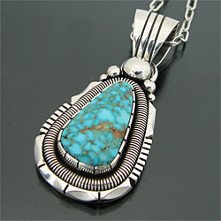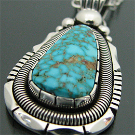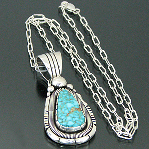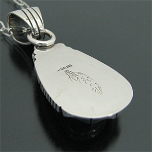 | NAVAJO/ナバホ族の人気アーティスト Will Vandever/ウィル・バンデバーがキングマンターコイズを用いて制作したネックレスです。 細かなウェブに美しいライトブルーが清潔感を与える、キングマンターコイズが使用されており、厚みのある土台と石の周りを取り囲むコイル状のシルバーはアーティストが得意とするハンドメイドワークの1つで、シルバーのワイヤーを巻いてコイル状に仕上げられています! 大きさ以上に存在感を感じ、高級感のあるナバホ族らしい大胆な作品に仕上がっております! バチカン部分の穴(約12mm×約9mm)が広いので、太めのチェーンと組み合わせるのもOKですよ! | ||