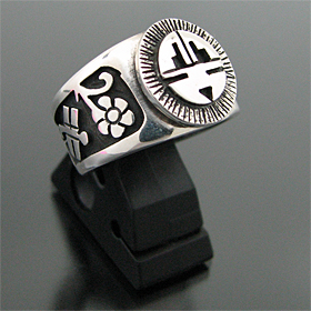 | HOPI/ホピ族の人気アーティスト Gerald Lomaventema/ジェロ・ロマヴェンテマが制作したリングです。 アーティストの得意とするオーバーレイが巧みに施されており、ベース部分のオーバレイ&サンフェイス部分もオーバレイで制作されています! ジェロのセンスある作品にはとても魅了されます! 両サイドにはフラワー、ドランゴンフライがデザインされており、細部まで拘りが感じられるお勧めのアイテムです♪ 40歳前半のGeraldは現在、数多くのジュエリーショーで活躍し、賞も多数獲得している人気のアーティストです! | ||