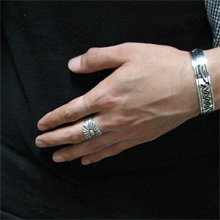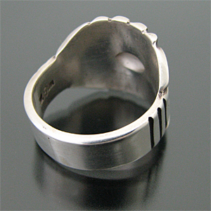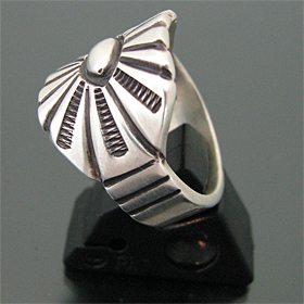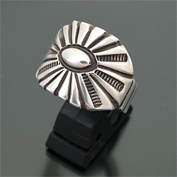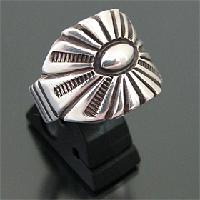 | NAVAJO/ナバホ族の巨匠 Wilson Jim/ウィルソン・ジムがスタンプワークを用いて制作したリングです。 ナバホ族の伝統的な力強い男性的なデザインが特徴で、厚みのあるシルバーにスタンプが深いため、より立体的にデザインが浮き出ています。 アンティーク調に仕上げられた艶消しになり、トーマス・ジムと兄弟になります。 シンプルながらこの存在感、ナバホ族らしい力強いスタンプ、トラディショナルなナバホデザインはさすがの一言です。 | ||
