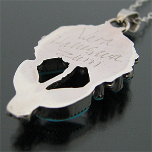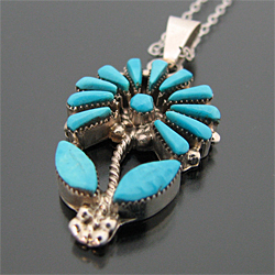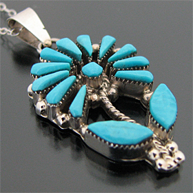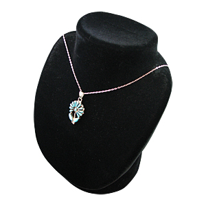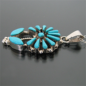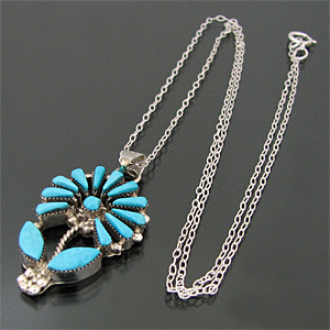 | ZUNI/ズニ族のアーティストがニードルポイン技法を用いて制作したネックレスです。 ズニ族が得意とする石や貝殻を針のように細くカットして花びらのようにアレンジする技法、ニードルポイントを用いて制作されており、カットされたターコイズがビッシリと使われています! フラワーモチーフのとても可愛いペンダントトップで、スタイリングもしやすく、ターコイズの爽やかさが胸元をより華やかに演出してくれます! 女性へのプレゼントにも最適なアイテムです! | ||