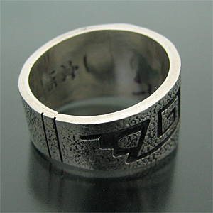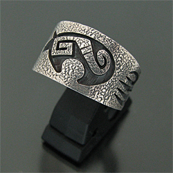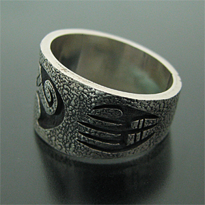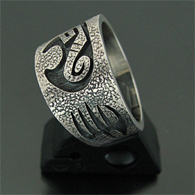 | HOPI/ホピ族の人気アーティスト Mitchell Sockyma/ミッチェル・ソッキーマが制作したベア(熊)・ベアパウモチーフのリングです。 オーバーレイ技法を用いて、力強さと勇気の象徴ベア(熊)・ベアパウがデザインされており、アーティストが得意とするトゥファーキャストと言われる石で型を作る技法が用いられています。 流し込む際の銀の溶け具合を見極めるタイミングが難しく、非常に手間と技術力を要求される技法の一つで、型の素材によって表面にざらつきが出たり、さまざまな質感が楽しめるのが特徴です。 Mitchell Sockymaは1972年からシルバーワークを開始したホピ族のベテランアーティストで、アーティストならではの個性が存分に感じられる素晴らしい作品です! | ||