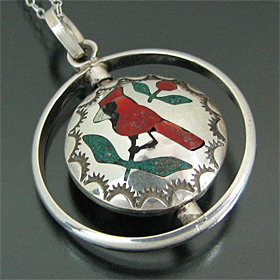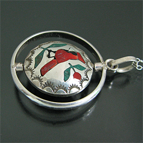 | ZUNI/ズニ族の人気アーティスト Quinton Quam/クゥイントン・クアムが制作したリバーシブルのネックレスです! フラットインレイという技法を用いた作品で、ペンダントの表面は凹凸が無く平面的に仕上がっています。 幸福の鳥と呼ばれるハミングバードがモチーフになっており、花の蜜を吸う様子を忠実に写実した、とても美しい作品です。 もう片面は赤い鳥カージナル(コウカンチョウ)がデザインされています。 カージナルはメジャーリーグのセントルイス・カージナルス、NFLのアリゾナ・カージナルスのチーム名にも使用されています。 リバーシブルタイプとなっていますので、1度に2度楽しめる仕様となっております! とてもフェミニンで女性らしいフラットインレイの作品は、女性に人気のアイテムで、大切な方へのプレセントにも最適です♪ サークル型の女性らしい華やかなデザインに魅了されます。 | ||