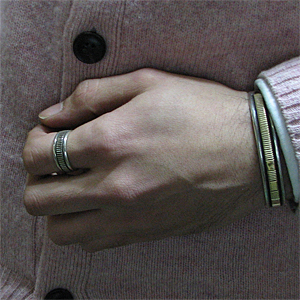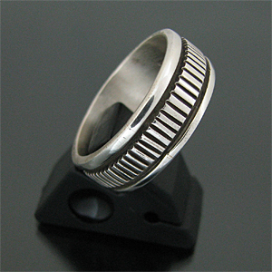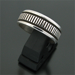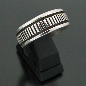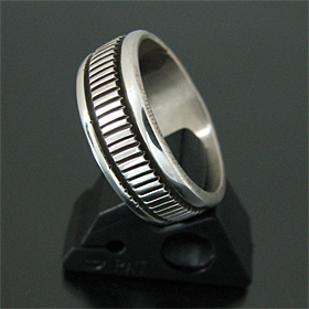 | NAVAJO/ナバホ族の人気アーティスト Bruce Morgan/ブルース・モーガンがスタンプワークを用いて制作したリングです。 シンプルながらも深く正確なスタンプ、年齢やスタイルを問わない組み合わせがお楽しみ頂けます。 スタンプワークはナバホ族が得意とする技法で、1880年〜90年代に発展しブレスレット・コンチョ・バックルなどの表面に、ハンマーでたがねを打ちつけ、銀の表面にデザインを施していきます。 スタンプ自体も各アーティストのオリジナルで、自動車のボルトを熱して先端に模様を刻みつけるなどして、さまざまなデザインを制作します。 ブルース・モーガンは1970年からシルバースミスとして活動をスタートした、ナバホ族のベテランアーティストになります! シルバースミスというだけでなく、カウボーイという顔も持ちあわせた多彩な人間性をもつアーティストです。 | ||