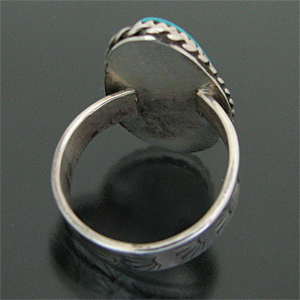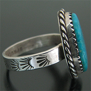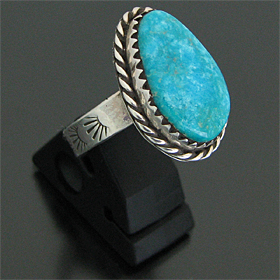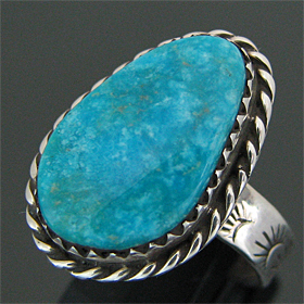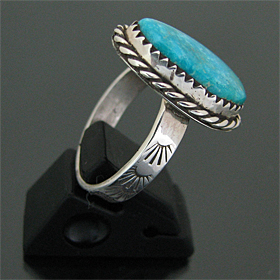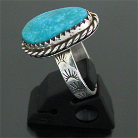| TAOS/タオス プエブロの有名アーティスト Sonny Spruce/ソニー・スプルースがキングマン(ターコイズ)を用いて制作したリングです。 大胆にキングマン(ターコイズ)が使用されているソニー・スプルースらしい作品で、巧みにスタンプワークが施されており、伝統を伝える素朴な力強さ、気品さが伝わってきます。 10数年前から作風は変わらず、オールドスタイルという枠にピッタリとはまるソニーの作品には、どこか安心感を感じます。 ジュエリーの他にダンスの名手としても有名で、イギリスの王族がこのタオス プエブロに訪問した時には、踊りについて説明役も任されています。 キングマンはアリゾナ州北西部のミネラル・パーク・マイニング地区にある全米最大規模の鉱山で採掘されています。山の片側で採れる石はイセカピーク、もう片側で採れる石はターコイズマウンテンとよばれています。 | ||