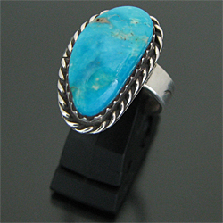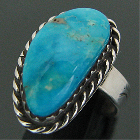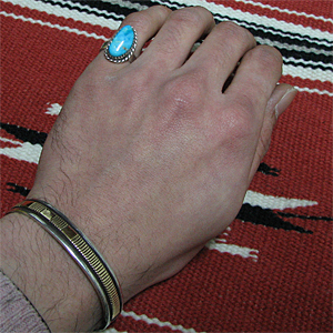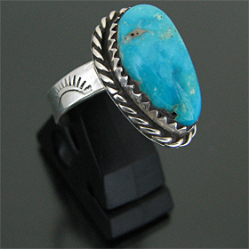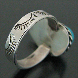 | TAOS/タオス プエブロの有名アーティスト Sonny Spruce/ソニー・スプルースがキングマン(ターコイズ)を用いて制作したリングです。 大胆にキングマン(ターコイズ)が使用されているソニー・スプルースらしい作品で、巧みにスタンプワークが施されており、伝統を伝える素朴な力強さ、気品さが伝わってきます。 10数年前から作風は変わらず、オールドスタイルという枠にピッタリとはまるソニーの作品には、どこか安心感を感じます。 ジュエリーの他にダンスの名手としても有名で、イギリスの王族がこのタオス プエブロに訪問した時には、踊りについて説明役も任されています。 キングマンはアリゾナ州北西部のミネラル・パーク・マイニング地区にある全米最大規模の鉱山で採掘されています。山の片側で採れる石はイセカピーク、もう片側で採れる石はターコイズマウンテンとよばれています。 | ||