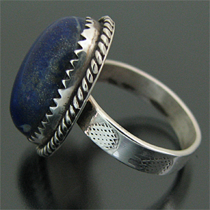 | TAOS/タオス プエブロの有名アーティスト Sonny Spruce/ソニー・スプルースがラピスラズリを用いて制作したリングです。 ソニー・スプルースの真骨頂とも言えるラピスラズリが使用された味わい深いリングで、シルバーの土台にはスタンプワークが施されています。 シルバーの土台はシンプルな作りで厚みがあり、ラピスラズリをよりキレイに、美しく演出してくれます。 ボリュームがあり存在感もあるので、単体でも十分なオーラがあります。 ラピスラズリは複数の鉱物の組み合わせで出来ており、こちらはパイライト(金色の部分)が入った、グレードの高いラピスラズリが使用されています。 ラピスラズリは和名で瑠璃(るり)と言われており、仏教の世界でも七宝の一つに数えられている宝石です。また聖なる石として古代から魔よけにも使われていたと言われています。 10数年前から作風は変わらず、オールドスタイルという枠にピッタリとはまるソニーの作品には、どこか安心感を感じます。 ジュエリーの他にダンスの名手としても有名で、イギリスの王族がこのタオス プエブロに訪問した時には、踊りについて説明役も任されています。 | ||