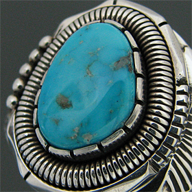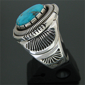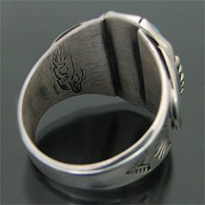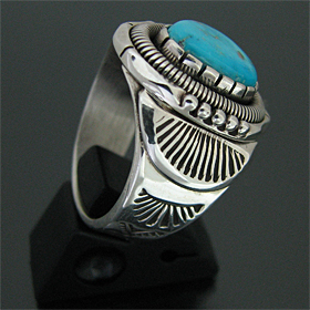 | NAVAJO/ナバホ族 の大人気アーティスト Will Vandever/ウィル・バンデバーがモレンシ(ターコイズ)を用いて制作したリングです。 ライトブルーにパイライトが入っているとても美しいモレンシ(ターコイズ)がセットされています。 厚みのある土台と石の周りを取り囲むコイル状のシルバーは、アーティストが得意とするハンドメイドワークの1つで、シルバーのワイヤーを巻いてコイル状に仕上げられています。 ベースにはスタンプワークが施されており、ナバホ族が得意とする技法の一つで、1880年〜90年代に発展しブレスレット・コンチョ・バックルなどの表面に、ハンマーでたがねを打ちつけ、銀の表面にデザインを施していきます。 スタンプ自体も各アーティストのオリジナルで、自動車のボルトを熱して先端に模様を刻みつけるなどして、さまざまなデザインを制作します。 アリゾナ州南東部で採掘されていたモレンシ(MORENCI)は美しいターコイズを産出する鉱山で、現在は掘り尽くされ、古くから現存するターコイズとしてたいへん人気があります。 濃いブルーから薄い水色発色し、黄鉄鋼(パイライト)が混じることで茶色くて細い筋状のマトリックスが現れるのが特徴です。 | ||